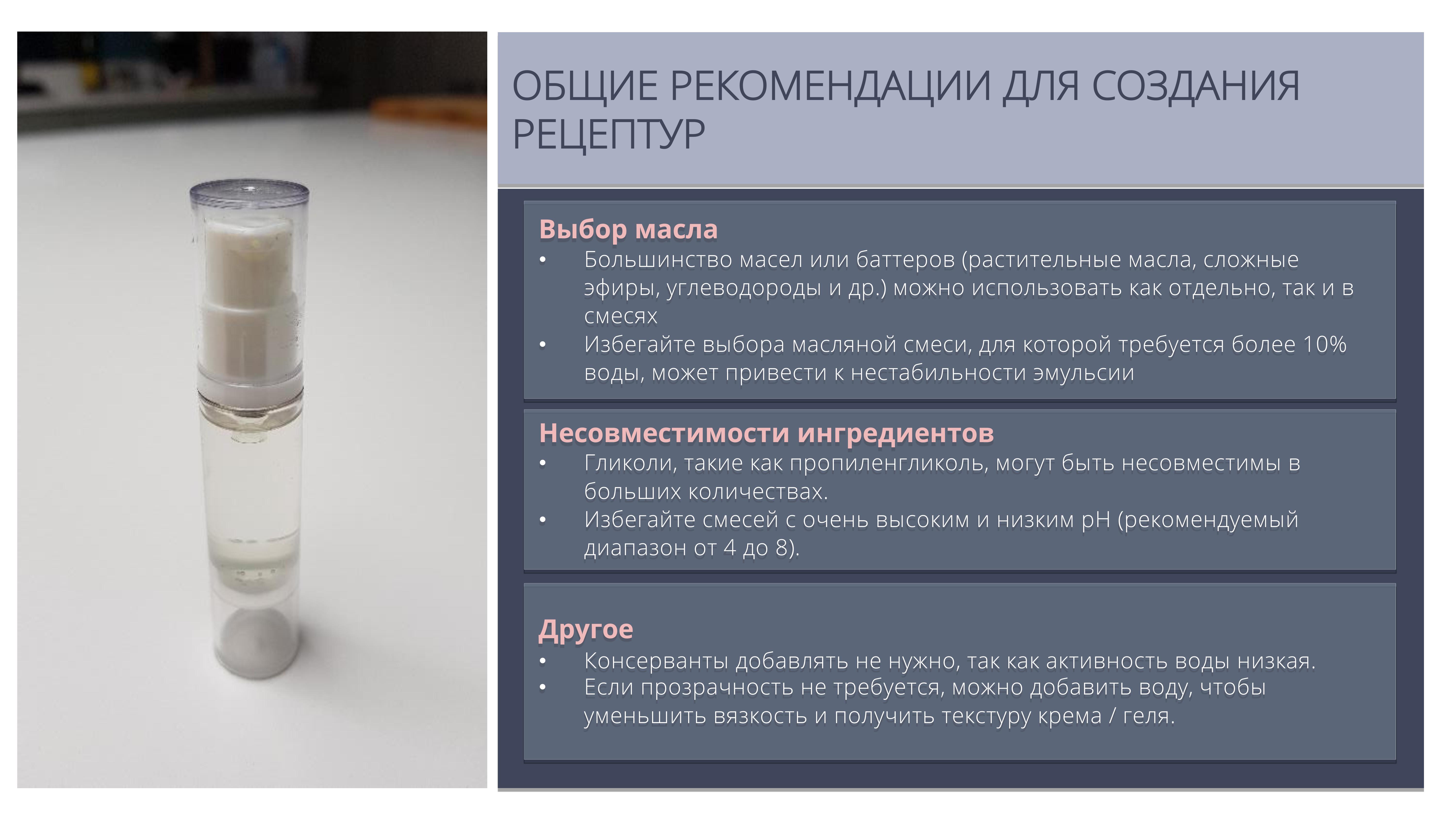 Совместим с различными типа жирных масел, эмолентов и эфирных масел.